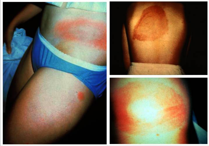 2 pav. Migruojančioji eritema. Šis bėrimas būdingas ankstyvajai lokalizuotai Laimo ligos stadijai. Bėrimas gali būti taikinio formos su tuščiu centru arba eriteminis visame plote (2)