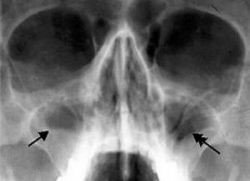 •    ančių (Waters) radiogramą (3 pav.) – matomas žievinio kaulo netekimas, ančio gleivinės sustorėjimas, ančio užtemimas (2, 3, 6).