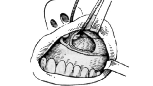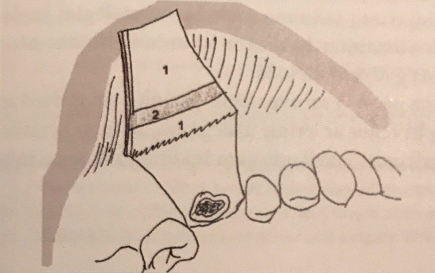 Vieną kartą yra pjaunama prieš alveolę, kitą – už jos. Toliau atkeliamas gleivinės ir antkaulio lopas. Ties lopo pagrindu (arčiau pereinamosios raukšlės) įpjaunama antkaulyje (lopo paslankumui padidinti). Audinių lopas užtempiamas ant alveolės ir prisiuvamas prie gomurio srities alveolės gleivinės (8 pav.). Siuvama pavienėmis siūlėmis nesirezorbuojančiu 4/0 ar 5/0 storio siūlu (3, 6). Labai svarbu, kad būtų gera lopo kraštų adaptacija ir nebūtų lopo audinių tempimo (13). Po operacijos svarbu nenaudoti didelės jėgos ir nesudaryti srovių (pvz., stiprus oro pūtimas per nosį), dėl kurių pakistų slėgis ir sukeltų fiksuoto defekto lopo pažeidimą.