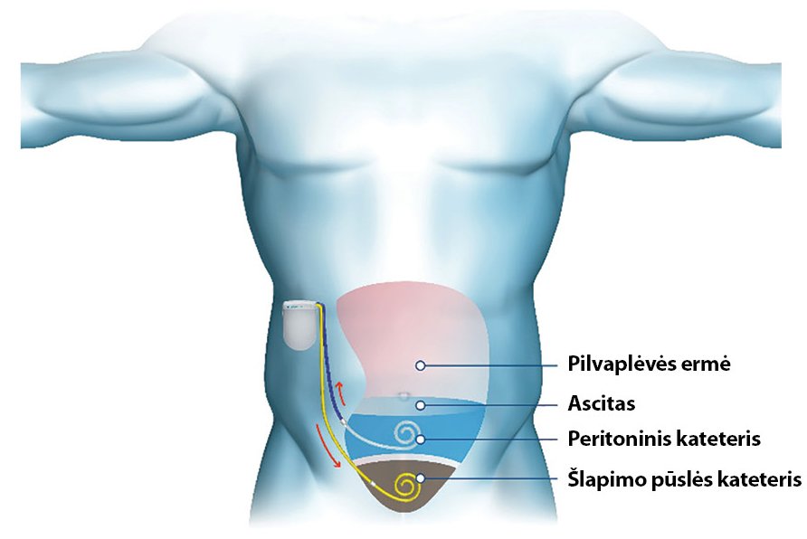 Ascitinio skysčio siurblys. Alfapump® sistema (ascitinio skysčio siurblys) (2 pav.) yra chirurginiu būdu implantuojamas subkutaninis prietaisas nuolatiniam dėl cirozės besikaupiančio ascito pašalinimui. Prietaisas perkelia pilvo ertmėje susikaupusį skystį į šlapimo pūslę ir ascitas pašalinamas šlapinantis. Tai alternatyvus, naujas ir efektyvus refrakterinio ascito gydymo metodas, kuris 85 proc. sumažina paracentezių poreikį ir pakartotinių hospitalizacijų skaičių, pagerina gyvenimo kokybę ir mitybinę būklę, tačiau įtakos pacientų išgyvenamumui neturi (2, 22). Galimi nepageidaujami reiškiniai pasireiškia 30–50 proc. pacientų. Dažniausiai pasitaiko infekcinės komplikacijos implantuojant sistemą (reikalinga profilaktika antibiotikais), kateterio užsikimšimas, iškritimas, ŪIP, hiponatremija (22). Procedūra atliekama tik specializuotuose centruose, be to, turi būti užtikrinta tolesnė pacientų priežiūra.